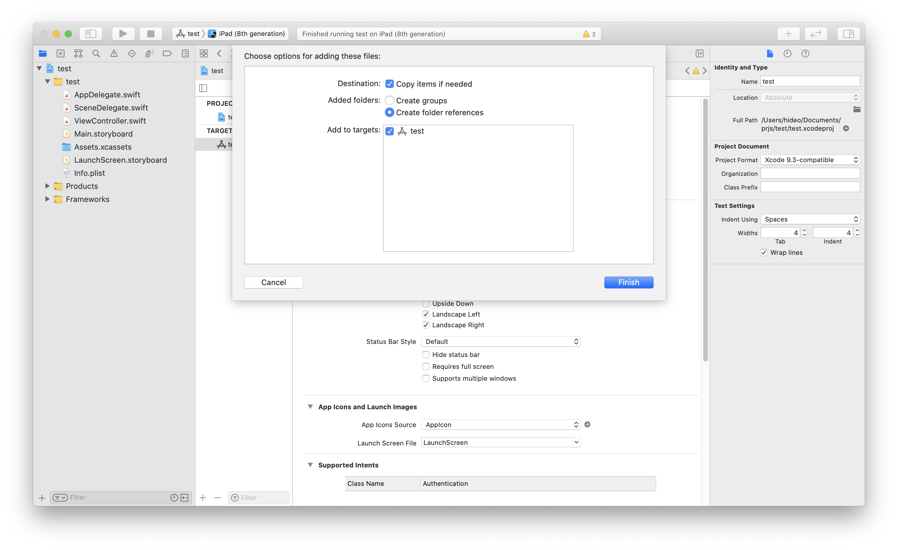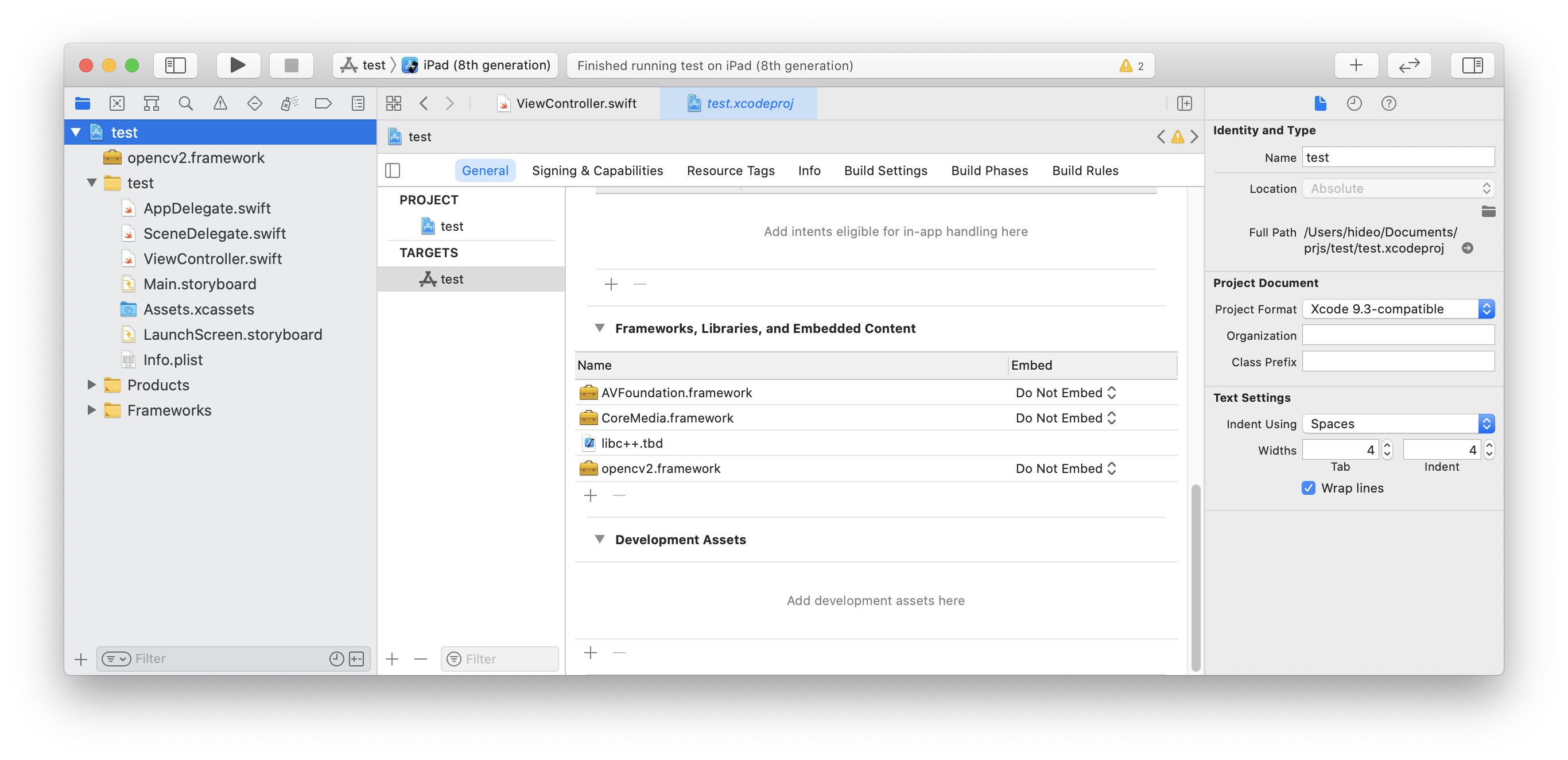 Project「test」を作成してwork/ios/opencv2.frameworkフォルダをxcodeのプロジェクトの直下にドラッグドロップ。