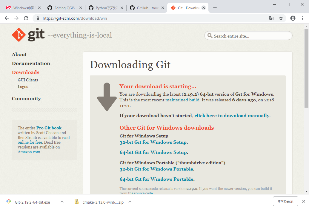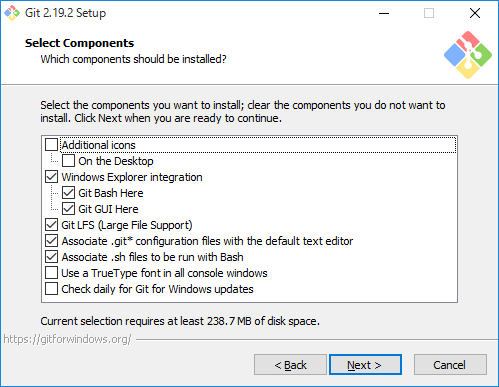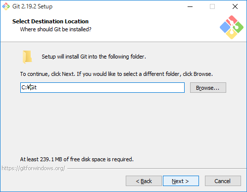 GitのサイトよりGit-2.19.2-64-bit.exeをダウンロード後、C:\Gitにインストール