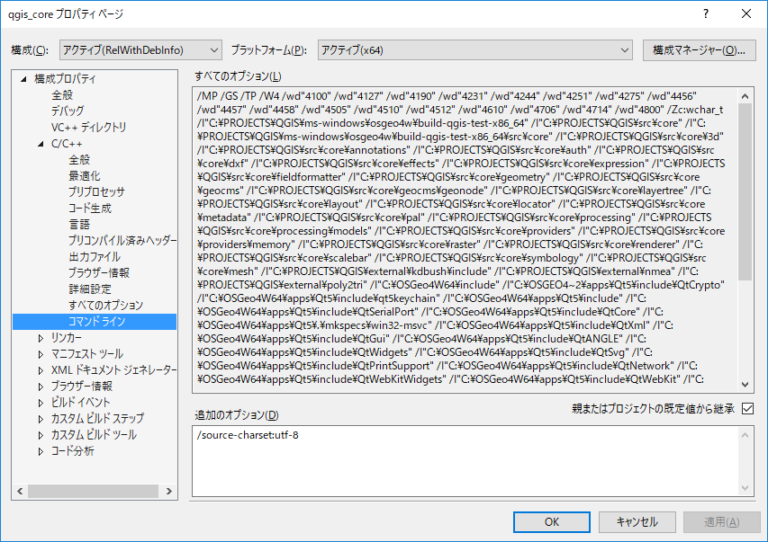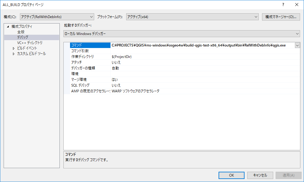 BUILDが終了したらALL_BUILDプロジェクトのデバッグ用のコマンドをC:\PROJECTS\QGIS\ms-windows\osgeo4w\build-qgis-test-x86_64\output\bin\RelWithDebInfo\qgis.exeに設定