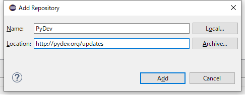 NameにPyDev、Locationに「http://pydev.org/updates」を指定しAddボタンをクリック