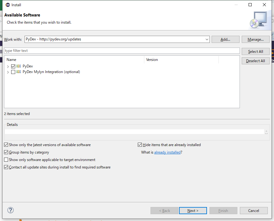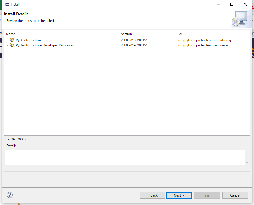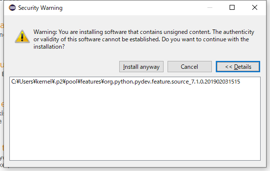 Detaileボタンを押してPydevのインストール先を確認してから「Install Anyway」を実行