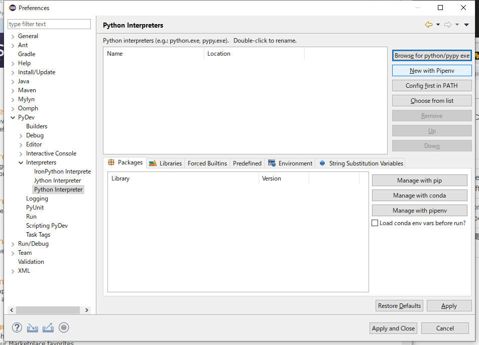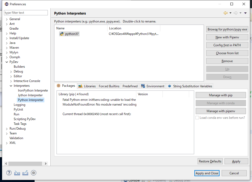 左のTreeでPyDev-Interpreters-Python Interpreterを選択