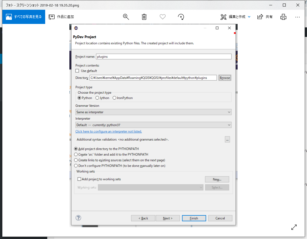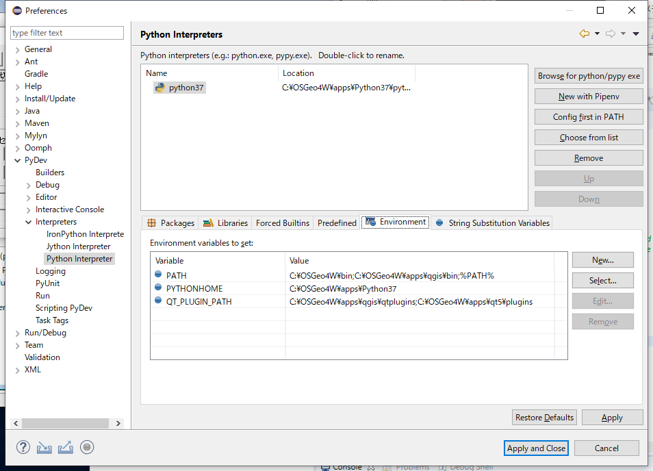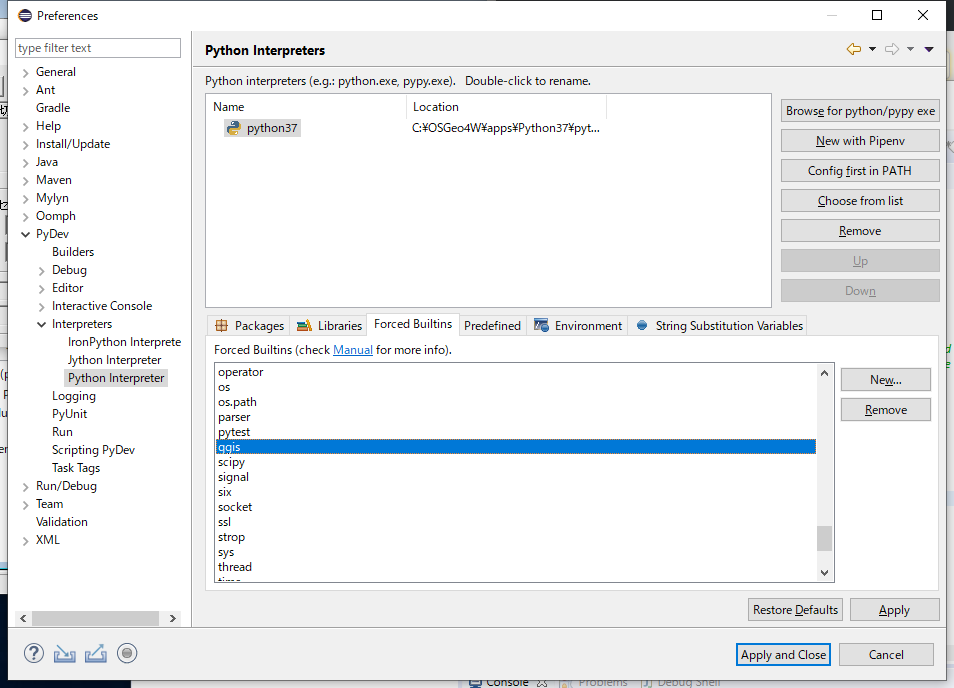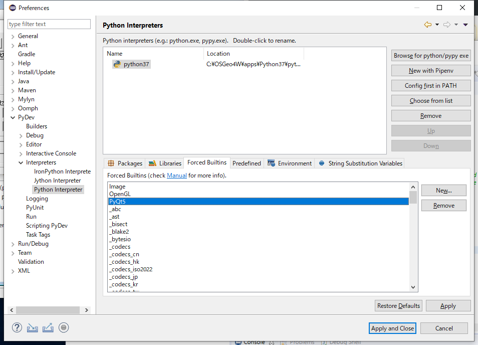 Forced Builtinsのタブを表示して「New」ボタンを押してqgisとPyQt5をそれぞれ登録