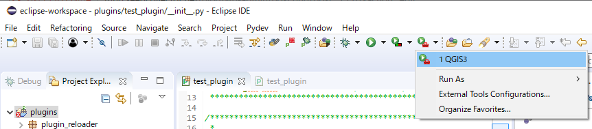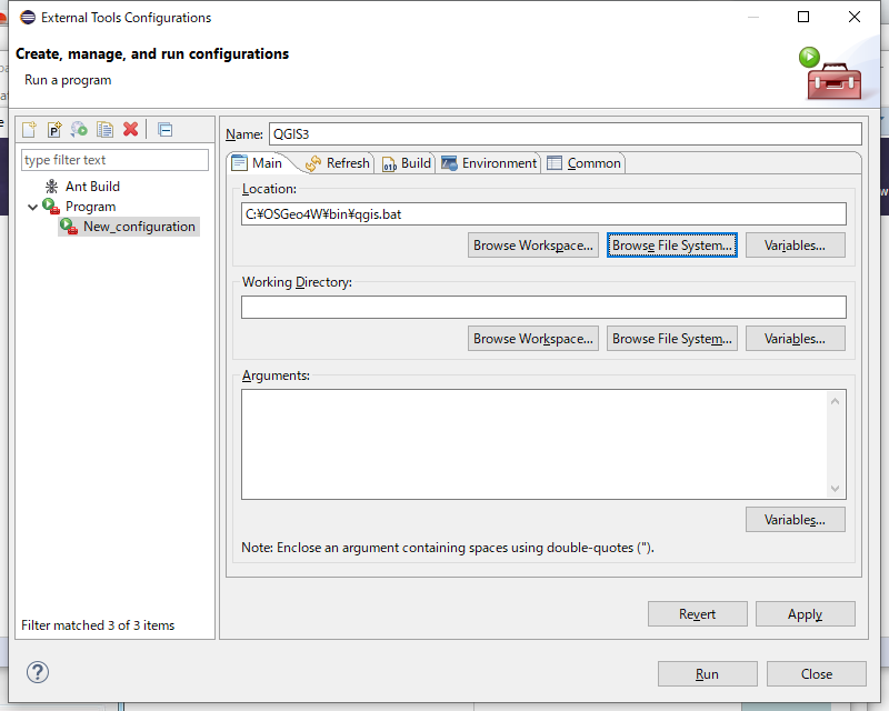 メニュ「Run」-「External Tools Configurations」を指定して外部TOOLとしてQGISを設定