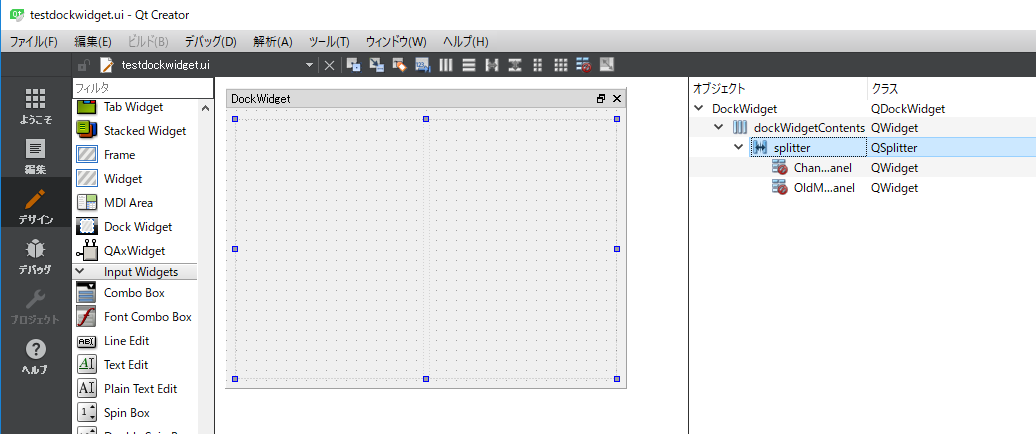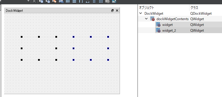 Splitterが親のQDockWidget一杯に表示されるようにdockWidgetContentsを選択して「ツールバー」の「水平に並べる」ボタンをクリック