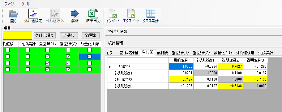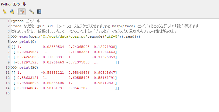 スクリプトを実行した後に相関行列(C)、偏相関行列(PC}を表示