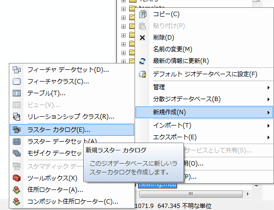 同様にカタログ上で作成したデータベースを選択してラスタカタログを新規作成
