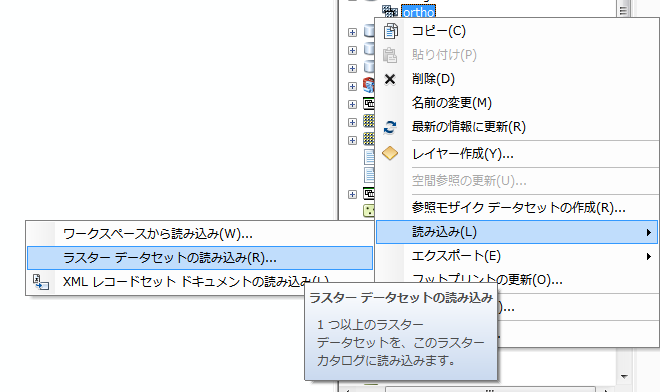 カタログ上で先ほど作成したカタログを選択してラスタデータセットの読み込みを選択