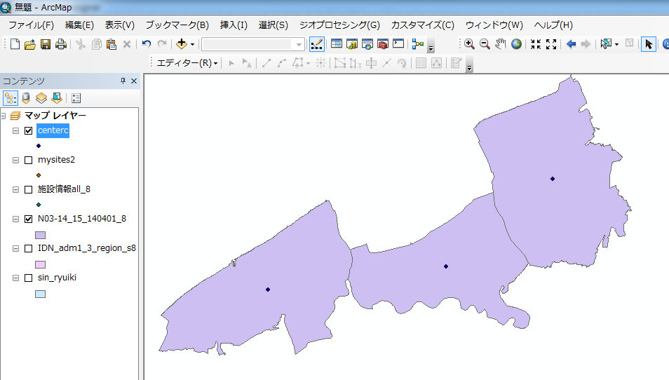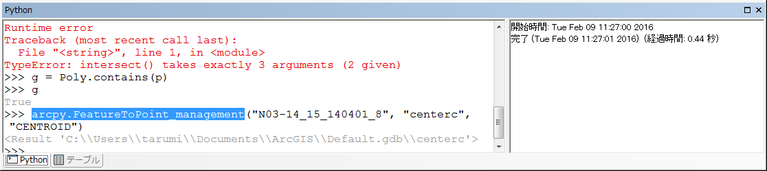arcpy.FeatureToPoint_management(入力レイヤ,出力レイヤ,オプション)で入力レイヤの重心が求まる