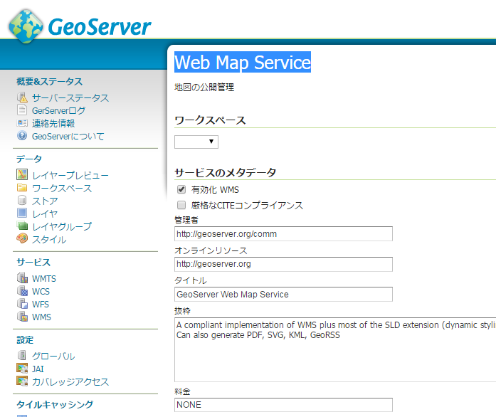 メニューのWMSを選択して「Web Map Service」の設定ページを表示