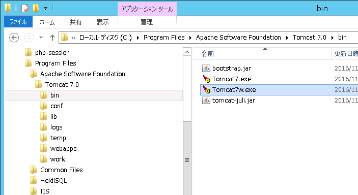 Tomcatのbinフォルダにある「tomcat7w.exe」を起動