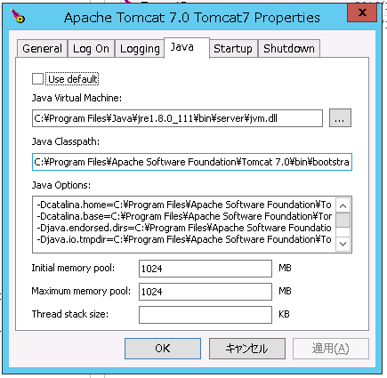 初期メモリと最大メモリは同一の値にしたほうがよいらしい。