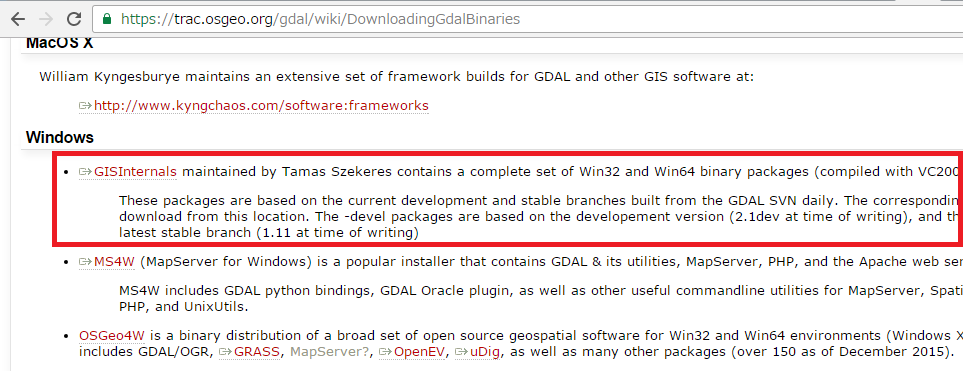 Windows上で動作するコンパイル済みのGDALモジュールはOsgeoのwikiのダウンロードサイトにあるリンクからたどった