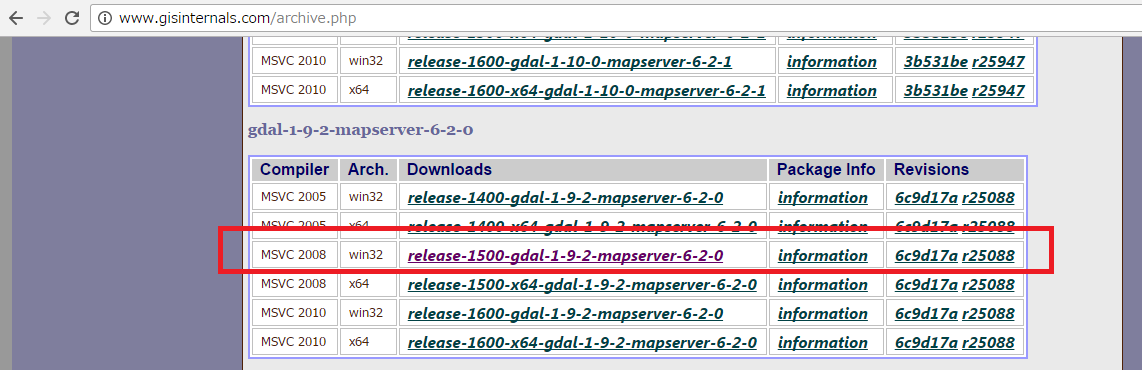 今回は1.9.2 vc2008 32bit版(release-1500-gdal-1-9-2-mapserver-6-2-0.zip)をダウンロード