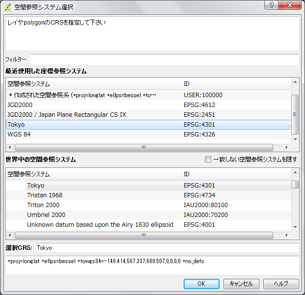 座標系を聞かれるので旧日本測地ならばEPSG:4301を選択、世界測地ならばEPSG:4326を選択