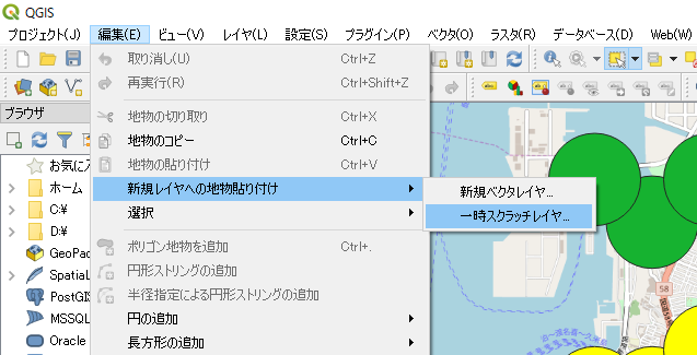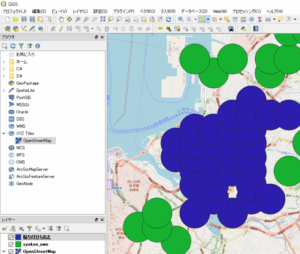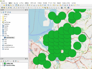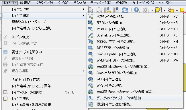 QGISを開き「レイヤ」-「レイヤの追加」-「デリミテッドテキストレイヤの追加」を選択し作成したCSVを開く