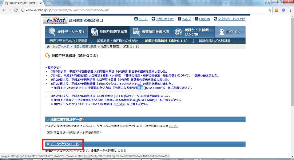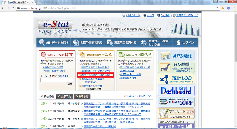 s-Statを開き、「地図や図表で見る」→「地図で見る統計(統計GIS)」を選択。