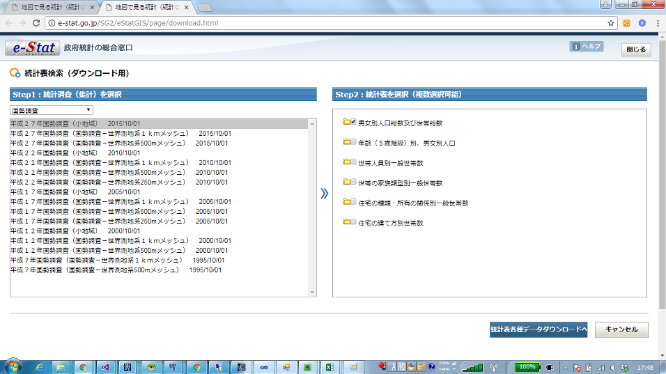 国勢調査(小地域)を選択し、統計表より対象項目を選択