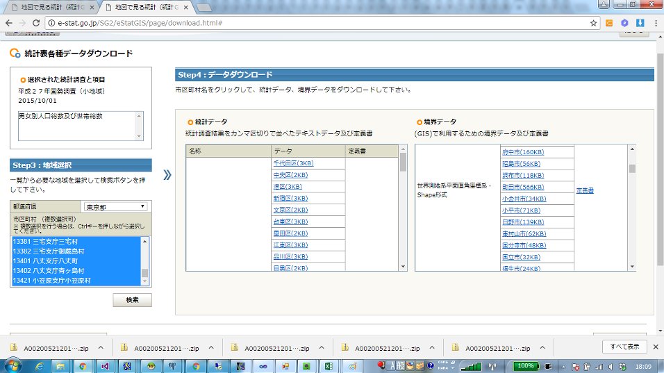 統計局のe-Statから小地域(町丁目、大字、字)のポリゴンと国勢調査の結果などがダウンロードできる。