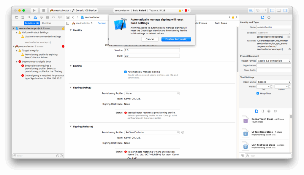 最近はProvisioning ProfilesなどはXcodeで自動作成するが、その設定がされていない。