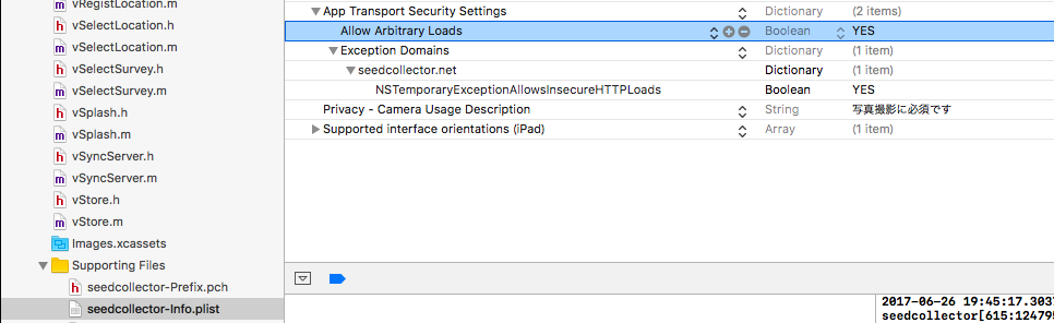 info.plistのキー「App Transport Security Settings」に「Allow Arbitrary Loads」を追加しYESに設定