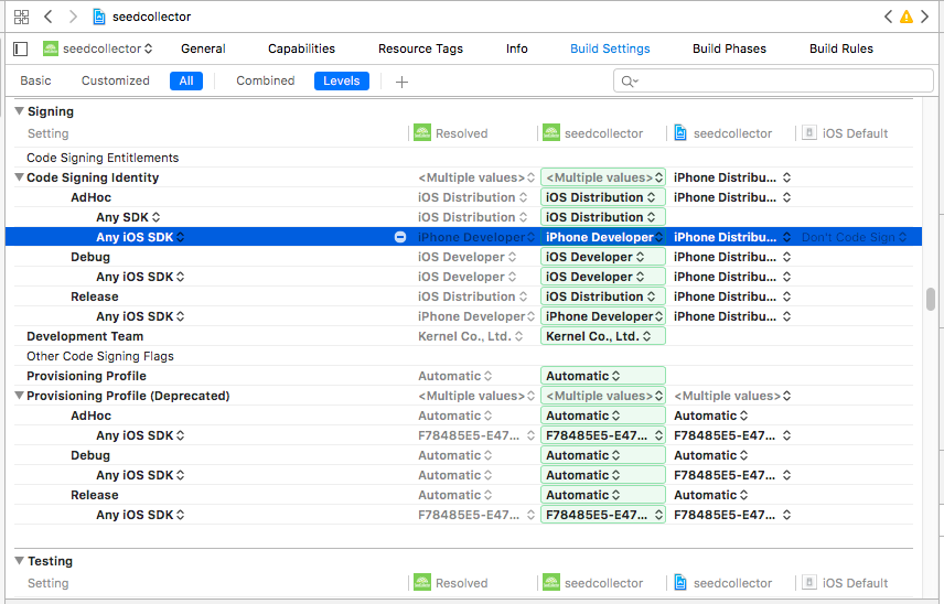 xcodeを開いてSigningのチェックを外しProvisioning Profilesに作成したAdHocを指定する