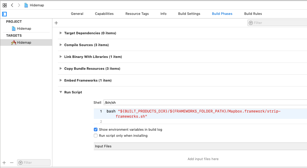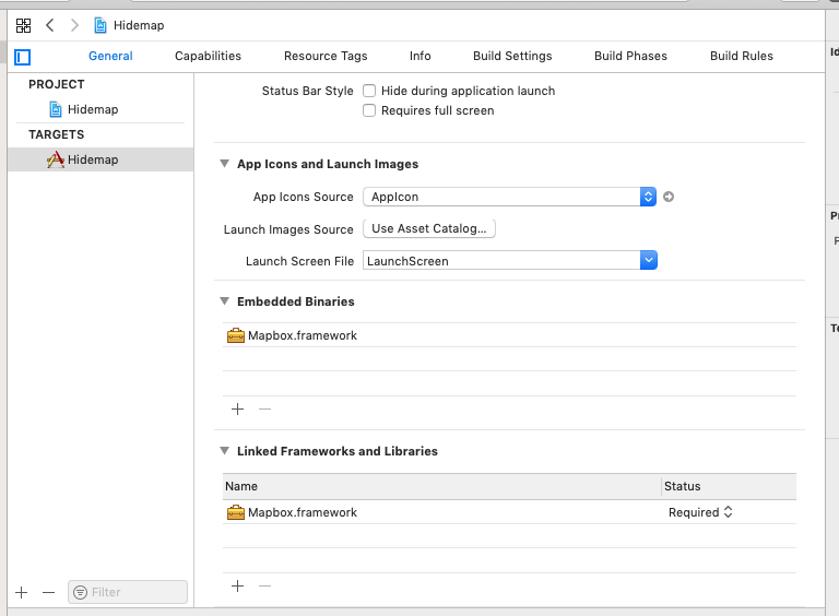ダウンロードしたmapbox-ios-sdk-5.4.0-dynamic.zipを展開し中のMapbox.frameworkをEmbedded Binariesにドラッグして参照を追加