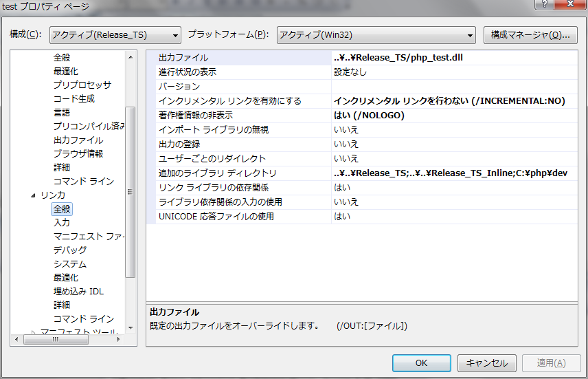 以上の設定完了後、コンパイルを実行するとC:\php-src\ext\php_text.sllが作成される