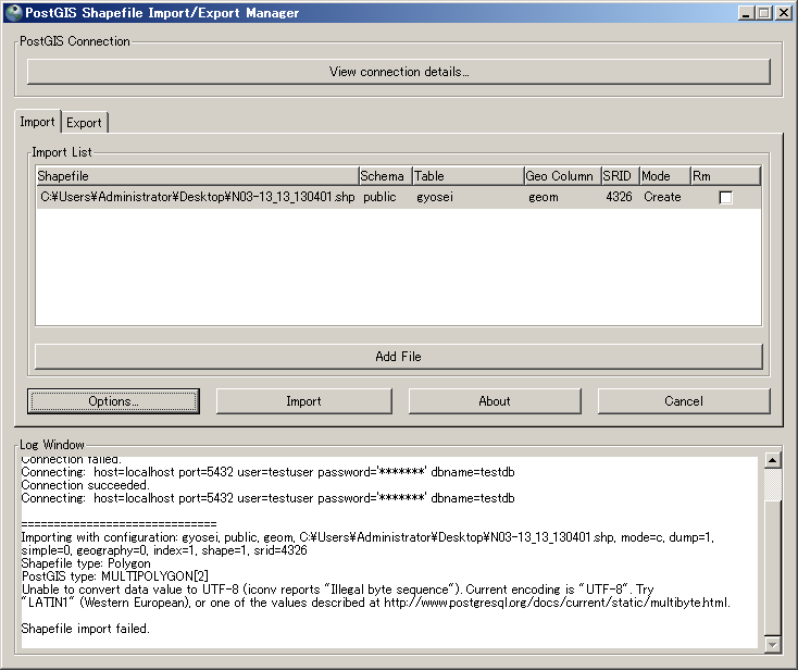 Add Fileボタンを押してインポート対象のShapeファイルを選択し、SRIDを指定