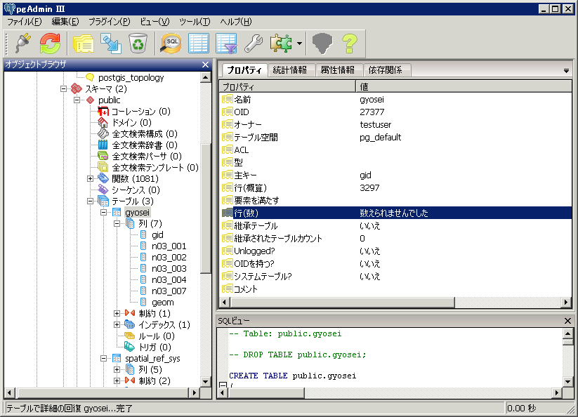次にAddGeometryColumnを使って空間データの項目を追加。