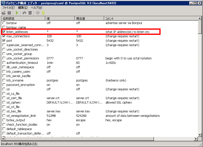 listen_addressesがコメントにされていたり、listen_addressesにlocalhostが設定されていると他ホストからの接続ができない