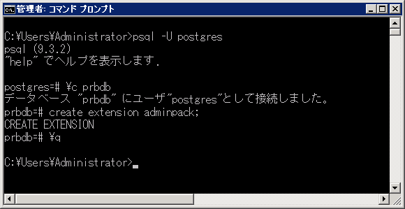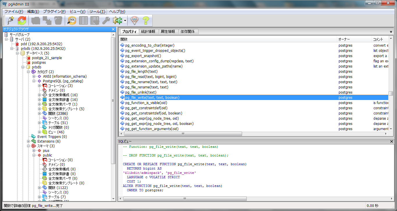 pgadminでも指導のメッセージが表示されなくなり、pgadminで確認するとadminpackの関数が実装されている