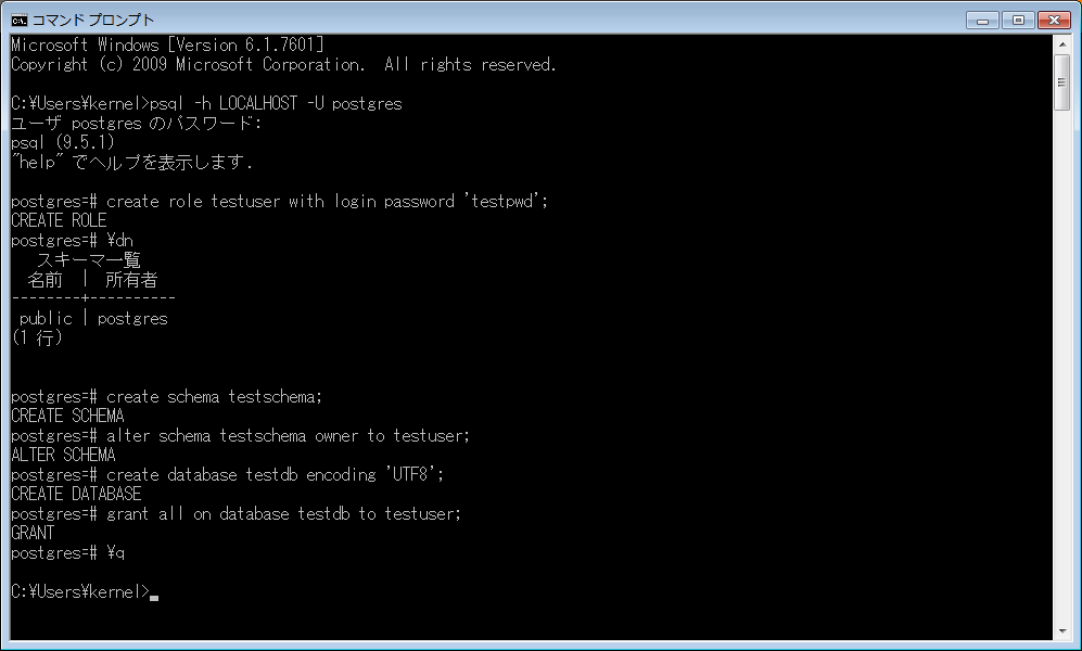 create database データベース名 encoding ‘UTF8’ ※create database testdb encoding ‘UTF8’ |