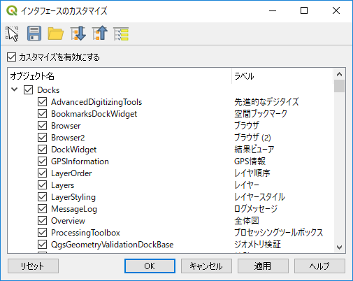 設定ファイルのフォーマットは実際にQGISの設定メニューにあるインターフェイスのカスタマイズで確認が可能